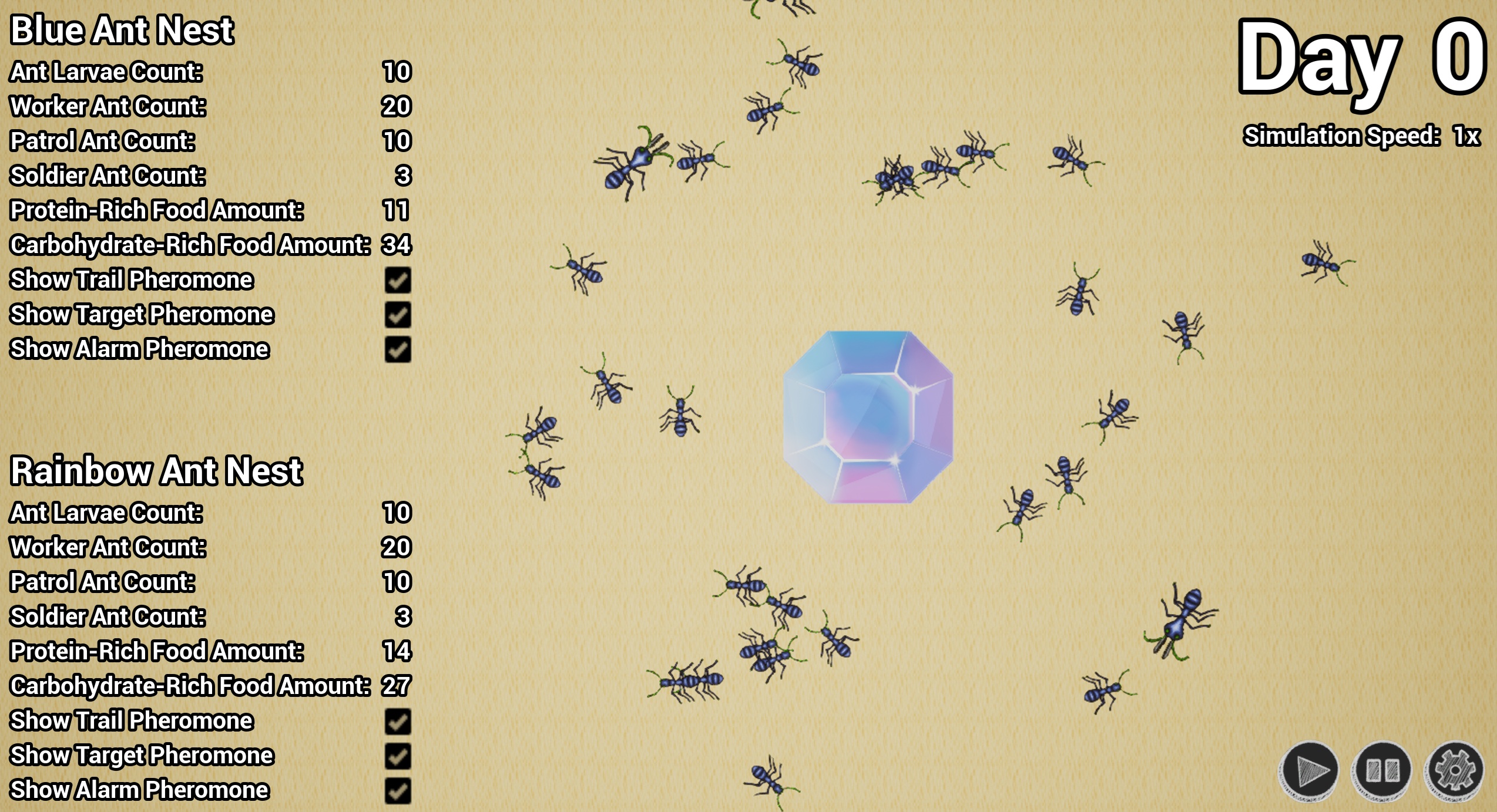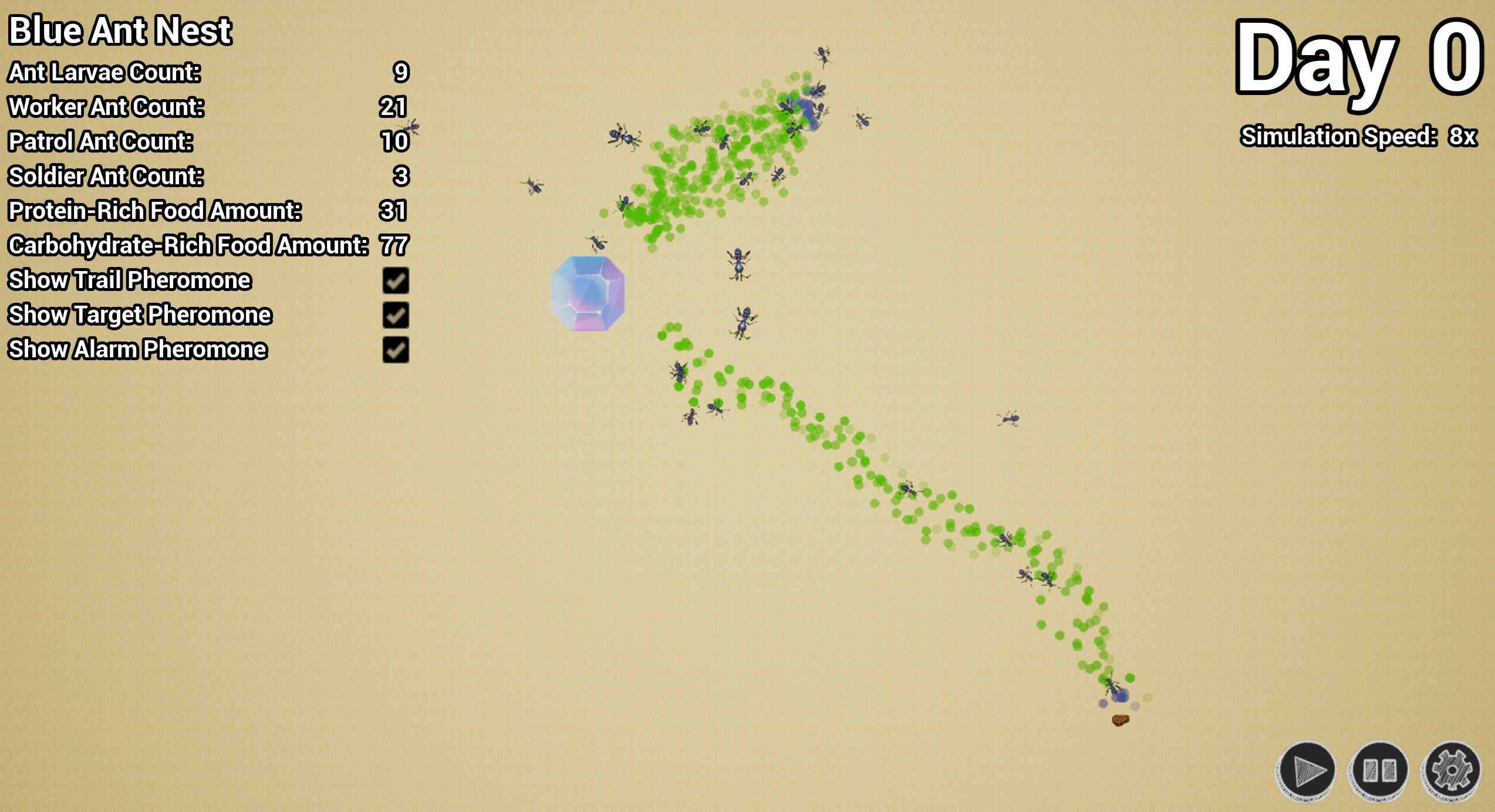 • Once the simulation begins, a nest statistics panel will appear on the left side of the screen. In this panel, you can also choose which types of pheromones left by the ants should be visible on the map.
