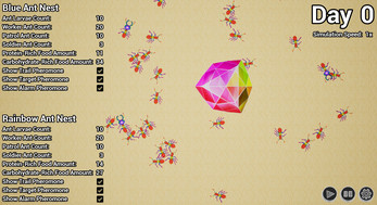 Ant Colony Simulator is an interactive simulation that presents the behavior and development of an ant colony in a dynamic environment. The simulation is based on realistic mechanics inspired by behaviors observed in nature, allowing players to observe how simple rules at the individual level lead to complex collective behavior across the entire colony.