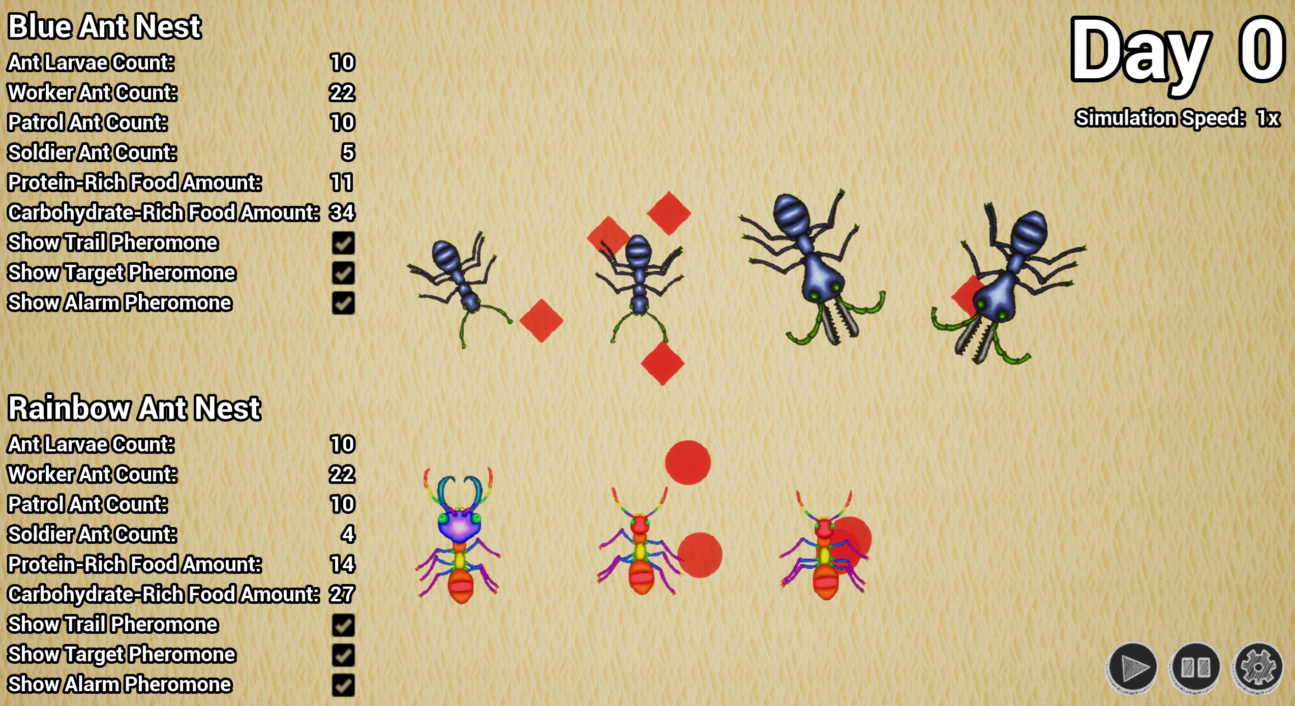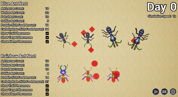 The simulation features two ant castes: workers and soldiers, each fulfilling clearly defined roles within the nest.